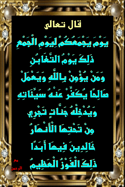 من من ا لم ت ح د ث ه أم ه عن يوم القيامة من من ا لم تخبر ه م عل مته أو م عل مه عن أهوال ذاك اليوم العظيم. ذلك يوم التغابن على أنه لا يجوز الغبن في المعاملة الدنيوية. ي و م ي ج م ع ك م ل ي و م ال ج م ع ذ ل ك ي و م الت غ اب ن و م ن ي ؤ م ن ب الل ه و ي ع م ل ص ال ح ا ي ك ف ر ع ن ه س ي ئ ات ه و ي د خ ل ه ج ن ات ت ج ر ي م ن.